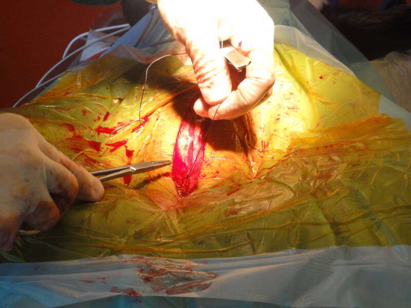 Jetzt muss nur noch der Bauch wieder zu. Der Verschluss erfolgt in drei Phasen mit verschiedenen Fäden. Zuerst die Bauchdecke mit dem dicksten Faden, dann die Unterhaut mit dem dünnsten. Beide lösen sich später selber auf. Nur die Haut wird mit einem Faden genäht, der sich nicht auflöst und nach etwa 10 Tagen gezogen werden muss.